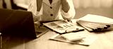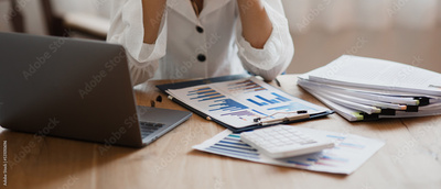 A close-up shot of a stressed business woman working from home on her laptop looking worried, tired, and overwhelmed.