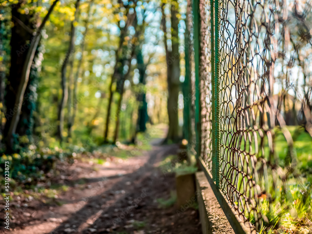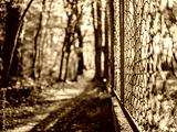 Wydeptana ścieżka idąca w środku lasu wokół drzew zielone otoczenie ciemny klimatyczny lasek