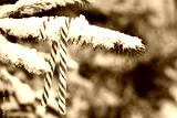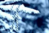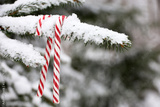 Christmas candy canes hanging on a fir tree branch covered with snow. Fairy winter forest, background for New Year celebration, cold weather