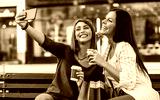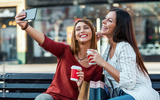Coffee break and selfie after shopping. Girls have fun together in the city. Consumerism, fashion, lifestyle