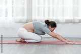 Happy Attractive Asian Pregnant woman practice Child Pose to meditation smile with big belly comfortable and relax,Pregnancy woman breathing and calm with yoga. Self Care Yoga Pregnant Concept