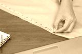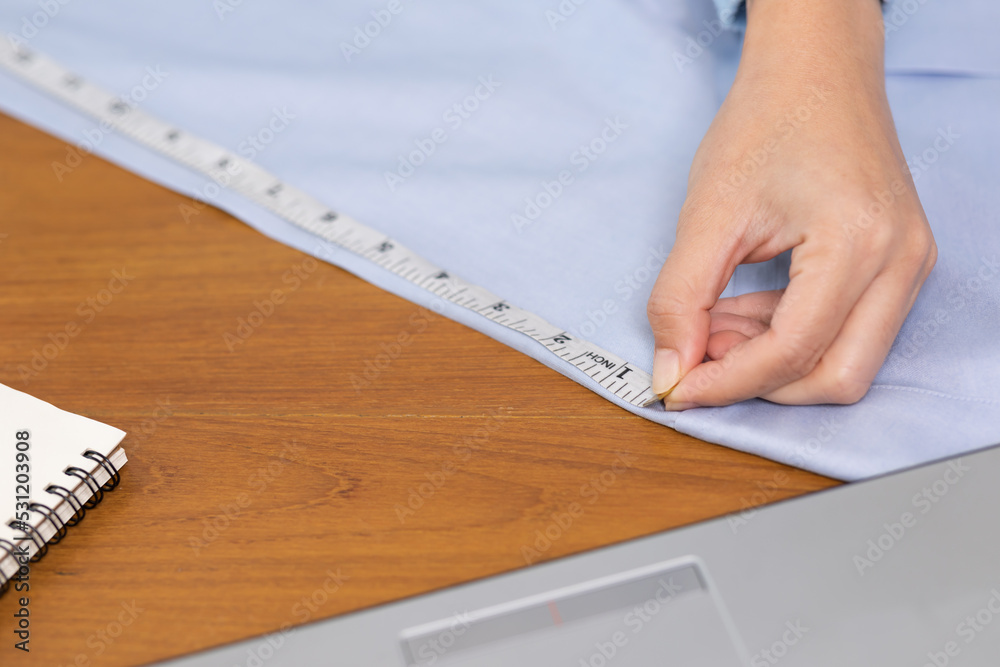 Close up stylish and designer woman working measurements with measure tape for new cloth or dressmaking collection. Fashion designer tailor working at table in her workshop. Freelance Designer concept