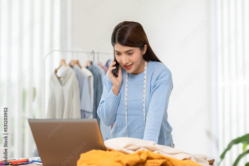 Asian stylish and designer woman talking on mobile phone with customer to get requirement for new cloth or new dress collection proud and happiness. Dressmaker business owner and start up concept