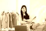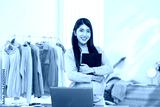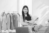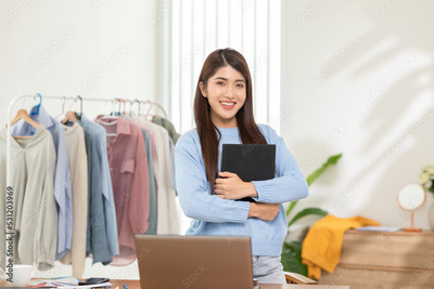 Happy Asian stylish and designer woman owner holding computer tablet smile and looking at camera with new cloth or new dress collection in shop or store ready for sale. Small businee startup concept