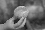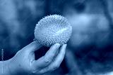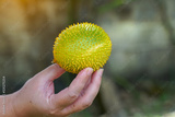 The young Gac fruit or Baby jackfruit in hand, fruit is oval-shaped. The bark has small thorns around the fruit. Soft and selective focus.