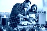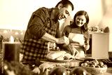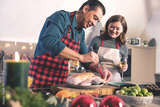 Happy man and woman cooking together traditional dinner for Christmas at home kitchen