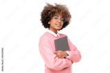 Fashion portrait of african american teen girl, high school or online course student holding laptop