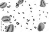 Coffee beans fall background. Black espresso coffee bean falling. Aromatic grain flying isolated on white. Concept for coffee product advertising.