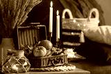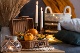 Cozy autumn concept. Home warmth in cold weather. Still-life. Pumpkins, wicker basket, candles, flowers and the inscription home on the coffee table in the home interior of the living room.