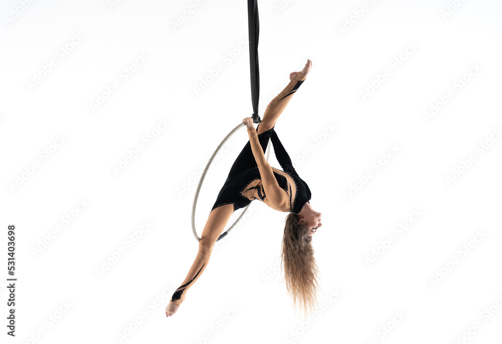 Slim and flexible woman, circus artist In aerial hoop isolated On White Background. Concept of desire, will and potential