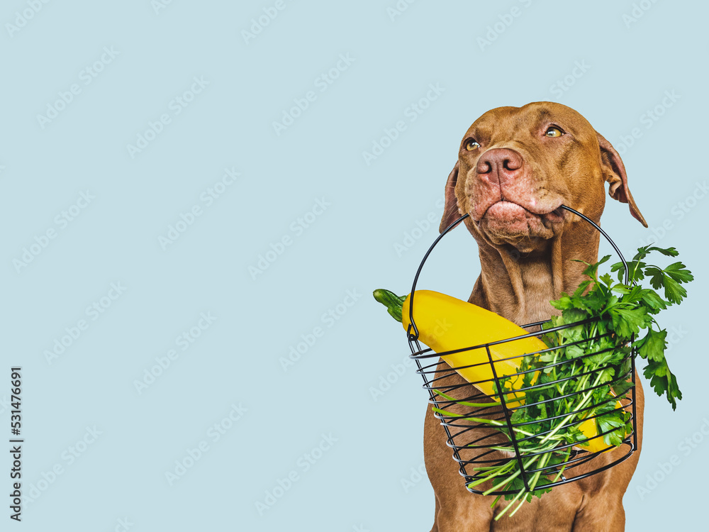 Pretty, lovable brown puppy and small basket of fresh vegetables. Closeup, indoors. Studio photo. Pet care. Concept of delicious and healthy food