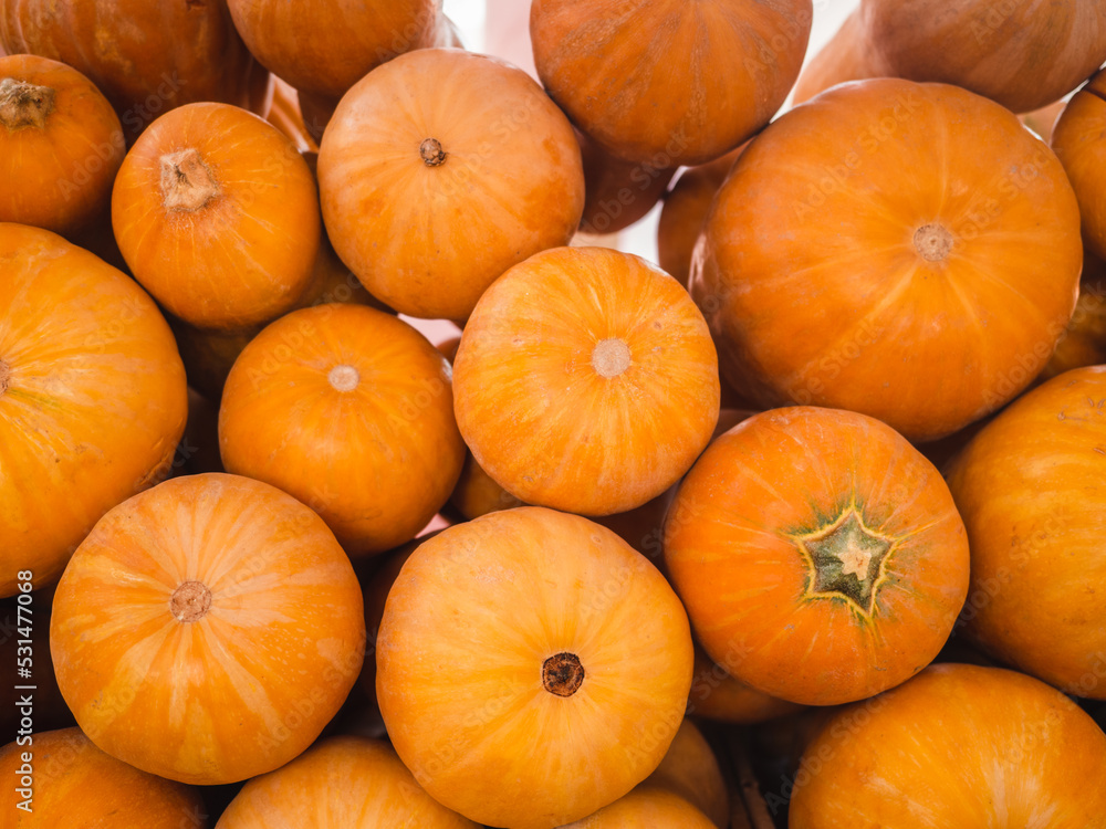 Ripe, juicy pumpkins lying on the table. Top view, close-up. Concept of tasty and healthy food