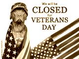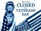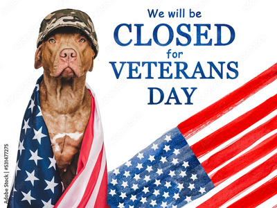 Signboard with the inscription We will be closed for Veterans Day. Adorable puppy and American Flag. Closeup, indoors. Congratulations for family, relatives, friends and colleagues. Pet care concept