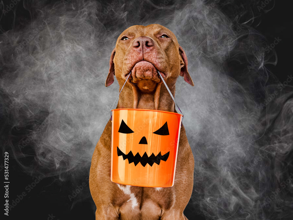 Happy Halloween. Lovable, pretty brown puppy. Close-up, indoors. Studio shot. Congratulations for family, relatives, loved ones, friends and colleagues. Pet care concept