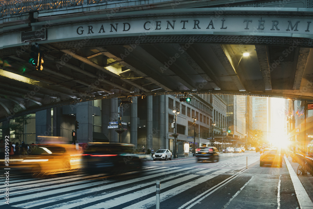 Taxis and cars driving down a busy street past Grand Central Station in New York City with sunlight shining in the background and motion blur effect