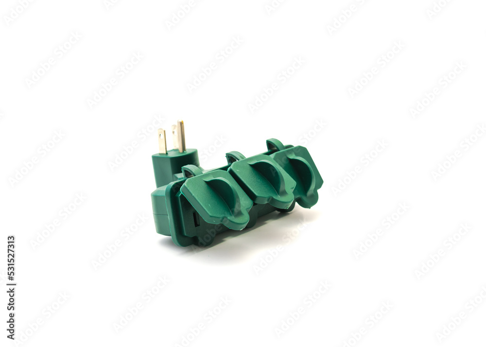 Green outdoor grounded wall tap adapter 3 outlet extender with covers isolated on white background