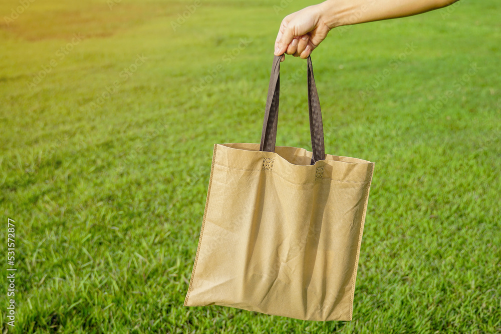 light brown cloth bag Carrying in the hand of an Asian woman on a natural green background. Concept to reduce global warming, reduce plastic waste, zero waste.Soft and selective focus.