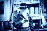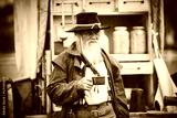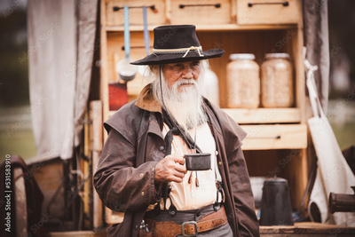Oldest smart cowboy wearing western style with cowboy hat hold a cup drinking coffee on early morning is 1800s countryside lifestyle concept.