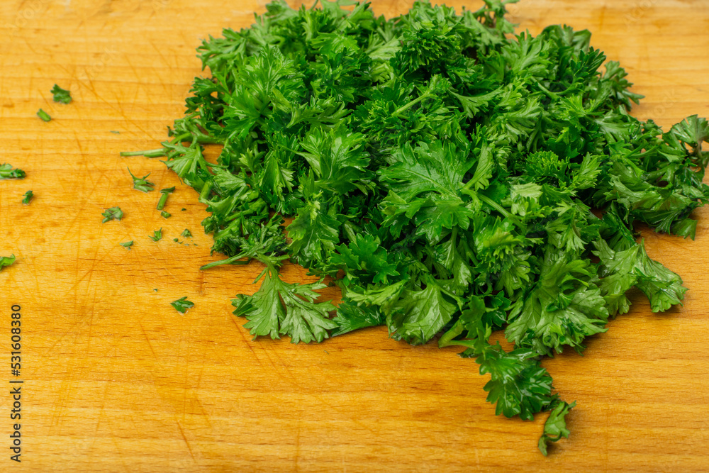 Fresh Green Chopped Parsleyon Wooden Cutting Board Background
