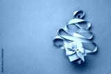 New Year card with concept of Christmas tree made of golden ribbon and gift box on olive background.