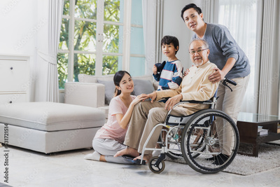 Happy Asian family of senior with beautiful daughter, her husband and grandson take care old man sitting on wheelchair in house, positive dad have strength and positive thinking