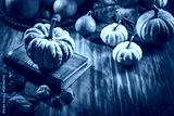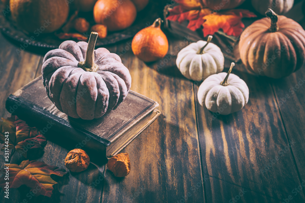 Rustic autumn still life with different pumpkins on wooden surface in vintage style