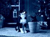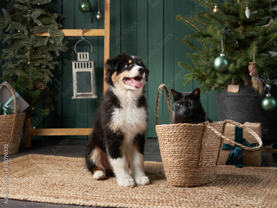 puppy and black cat playing by Christmas tree. Australian Shepherd dog, pets In holiday Decorations