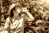 female volunteers rest and drink water After helping society by collecting garbage in the forest
