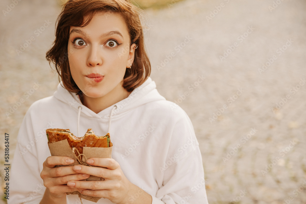 Close-up of european young girl holding sandwich in her hands, eyes wide open from how delicious it is. Teenager purses lips, wearing white sweatshirt. Diet concept.