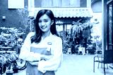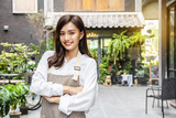 Successful small business young asian owner woman standing with looking at camera posing crossing arms, Portrait of waiter salesman worker wearing apron standing at work space smiling friendly