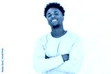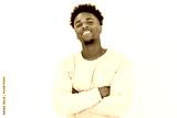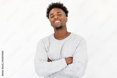 Portrait of happy African American man standing with folded arms. Young bearded guy wearing white sweater looking at camera and smiling against white background. Happiness concept