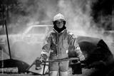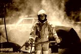 Firefighter man wearing protective fire suite and helmet with equipment and accessories is fire safety accident protection is industry safety concept.