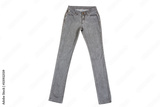Grey jeans isolated on white background. Fashion denim pants wear mock up and copy space. Flat lay closeup clothes. Casual blank template cloth.