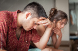 A man and a woman are arguing on the bed in the apartment. They are in a bad mood because they have love problems.