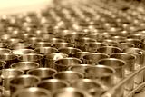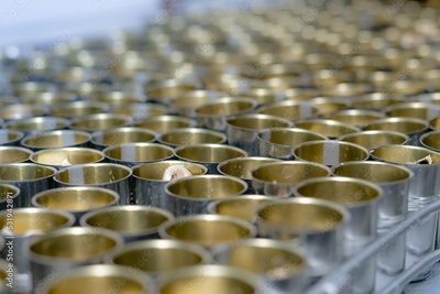 Canned fish factory. Food industry. Many can of sardines on a conveyor belt. Sardines in red tomato sauce in tinned cans at food factory. Food processing production line. Food manufacturing industry.