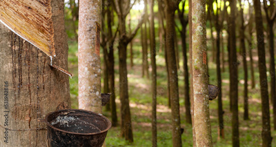 Rubber tapping in rubber tree garden. Natural latex extracted from para rubber plant. Rubber tree plantation. The milky liquid or latex oozes from wound of tree bark. Latex collect in small bucket.