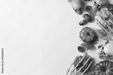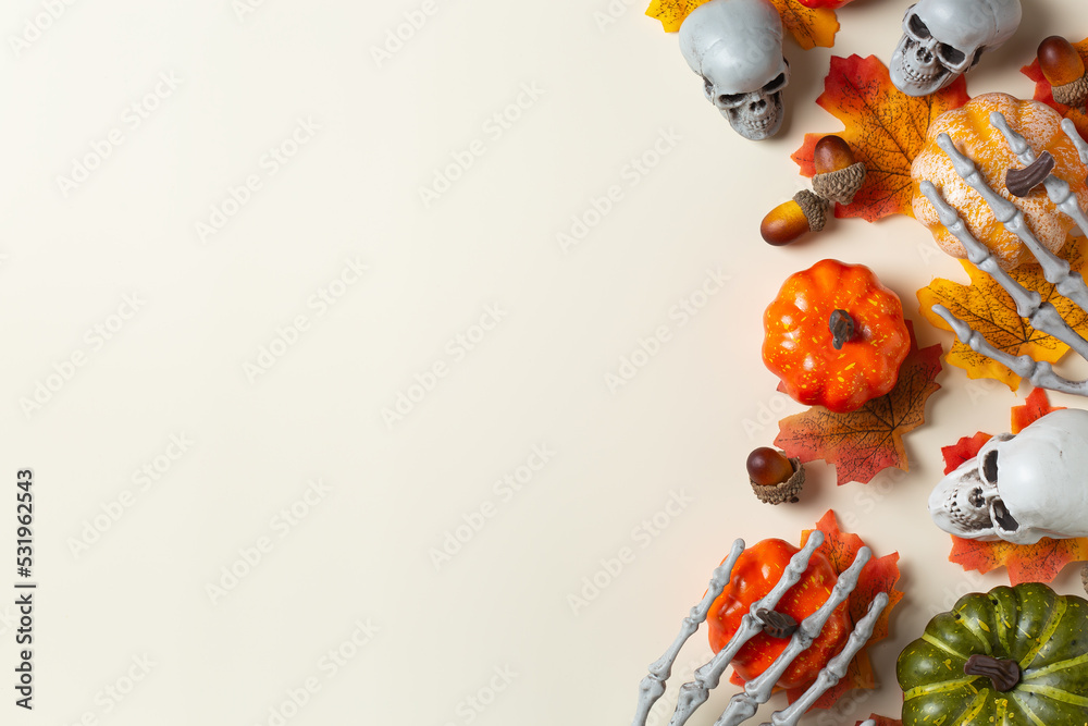 Halloween greeting card with pumpkin, skulls, bony hands and leaves