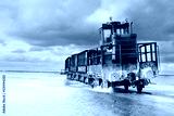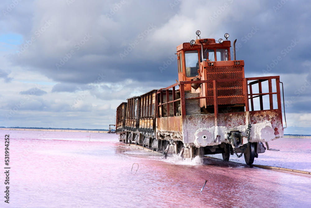 lake Burlin Altai. Old train rides on the railway laid in the water through the salt lake. train travels from water. Salt lake bursol. Mined salt in Lake Burlin. Altai. Russia. Bursolith.