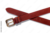 A crossed brown leather belt with a metal buckle on a white background is isolated.