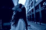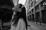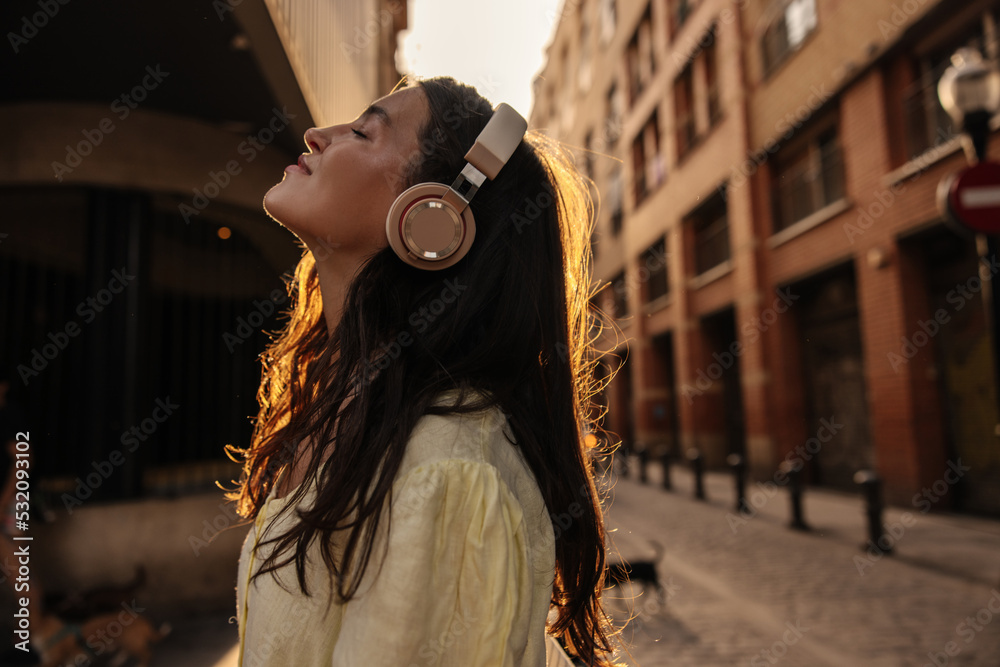 Nice young caucasian girl eyes closed listens to music using headphones standing on street. Brunette is having relaxed time, wearing dress. Audio technology concept