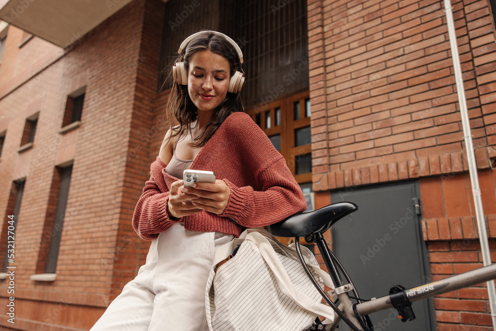Nice young caucasian woman in headphones, likes to listen to online music from smartphone on street. Brunette wears casual spring clothes. People and technology concept.