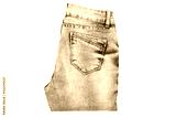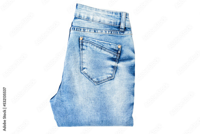 Blue jeans isolated on white background. Closeup female denim pants. Top view and mock up. Copy space flat lay fashion cloth. Back side pocket.