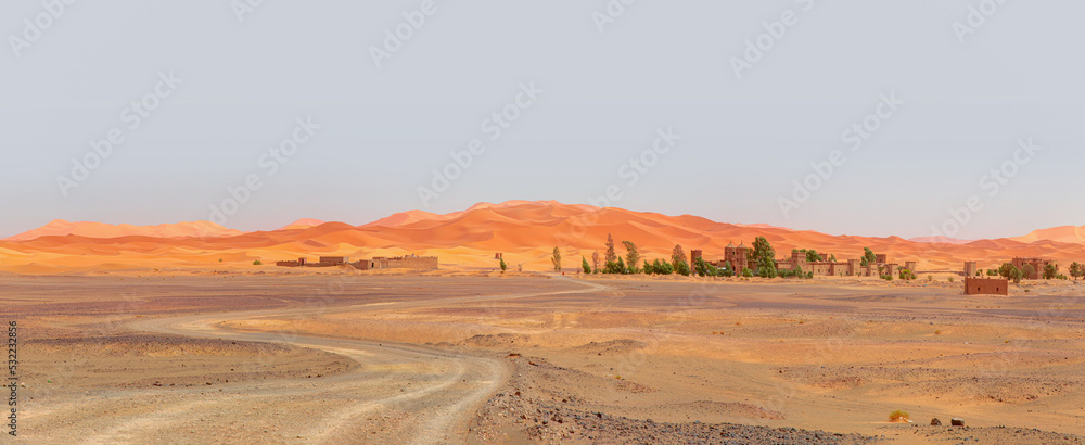 General view of the Merzouga hotels district - Merzouga, Sahara, Morocco