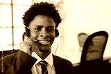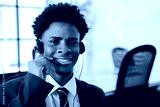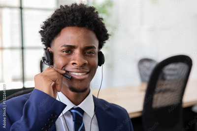 Portrait of happy male office worker answering call. Smiling operator looking at camera, wearing headset. Business, support, office work concept.