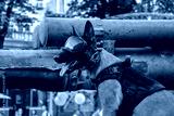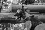 A service military dog in an outfit at destroyed russian military equipment at Khreshchatyk street in Kyiv