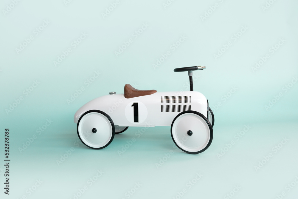 Retro style beige toy car on blue background. Stylish toy for toddler boy. Kid's playing room interior. Copyspace