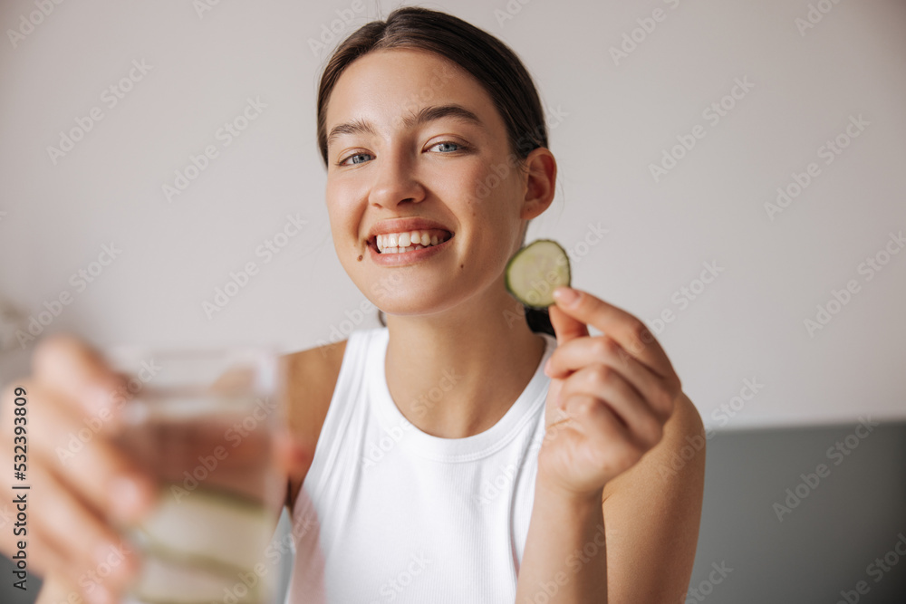 Beautiful young caucasian woman wears white singlet holding slice of cucumber and glass of water home. Brunette hair female smiling at camera. Concept healthy, beauty.