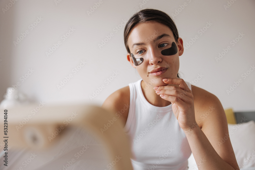 Calm young caucasian woman sitting on bed and looking at herself in mirror. Brunette hair female wears casual clothes home. Concept natural beauty.