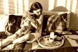 Breakfast in bed . Girl with a cat look at the breakfast tray.