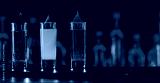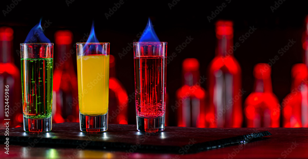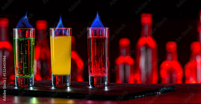 Cocktails Party Shots and Shooters on bar counter in a restaurant, pub. Miniature mixed drinks. Alcoholic cooler beverage at nightclub on dark background